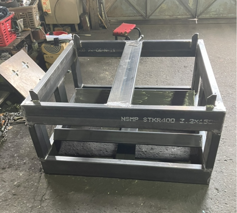 お客様よりご要望いただきましたサイズ、形状でH鋼を切断~溶接まで行い、機械架台製作を行った一例となります。(下画像参照)